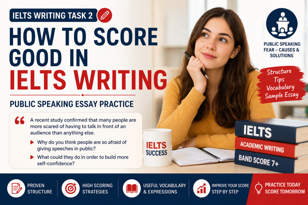 Improve your IELTS Writing Task 2 performance with a real practice essay, strong structure, useful vocabulary, and expert tips. In this guide, we break down a common topic about fear of public speaking and show you how to write a high-scoring response.